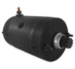 Hitachi type starter motor features a black finish.